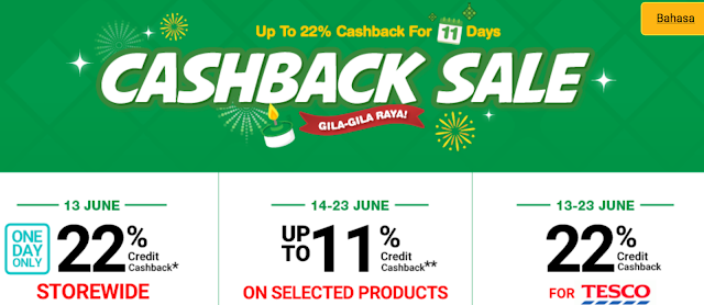 Don't miss your 22% Credit Cashback from today & have a Gila-Gila Raya! #gila2raya11street #11streetmy- 13 June: 22% Credit Cashback* Storewide (One Day Only)