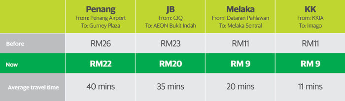 - We have revised our fares in Penang, Johor Bahru, Melaka and Kota Kinabalu incorporating time and distance. With the revision, your fares will be up to 15% lower.