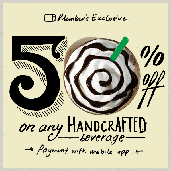 Exclusive for My Starbucks Rewards members. Thank you for staying LOYAL with us! Because My Starbucks Rewards believes in rewarding our valued customers, below deal is for you. Now paying with Starbucks Card, checking card balance and tracking rewards is even easier with our mobile app. Available for iOS and Android. 50% OFF ON ANY HANDCRAFTED BEVERAGE! Purchase any handcrafted beverage and we will pay half of your cup. Drop by any of our Starbucks Malaysia store for a cup of your favorite handcrafted beverage today.50% OFF with Starbucks Malaysia Mobile App Promo Terms & Conditions