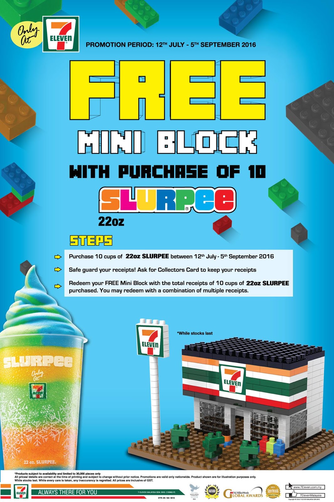 Get a FREE 7-Eleven Mini Block when you purchase 10 Slurpee (22oz) in a single or combination of receipts! Available in stores now till 5 September 2016!Promotion Period: 12 July - 5 September 2016