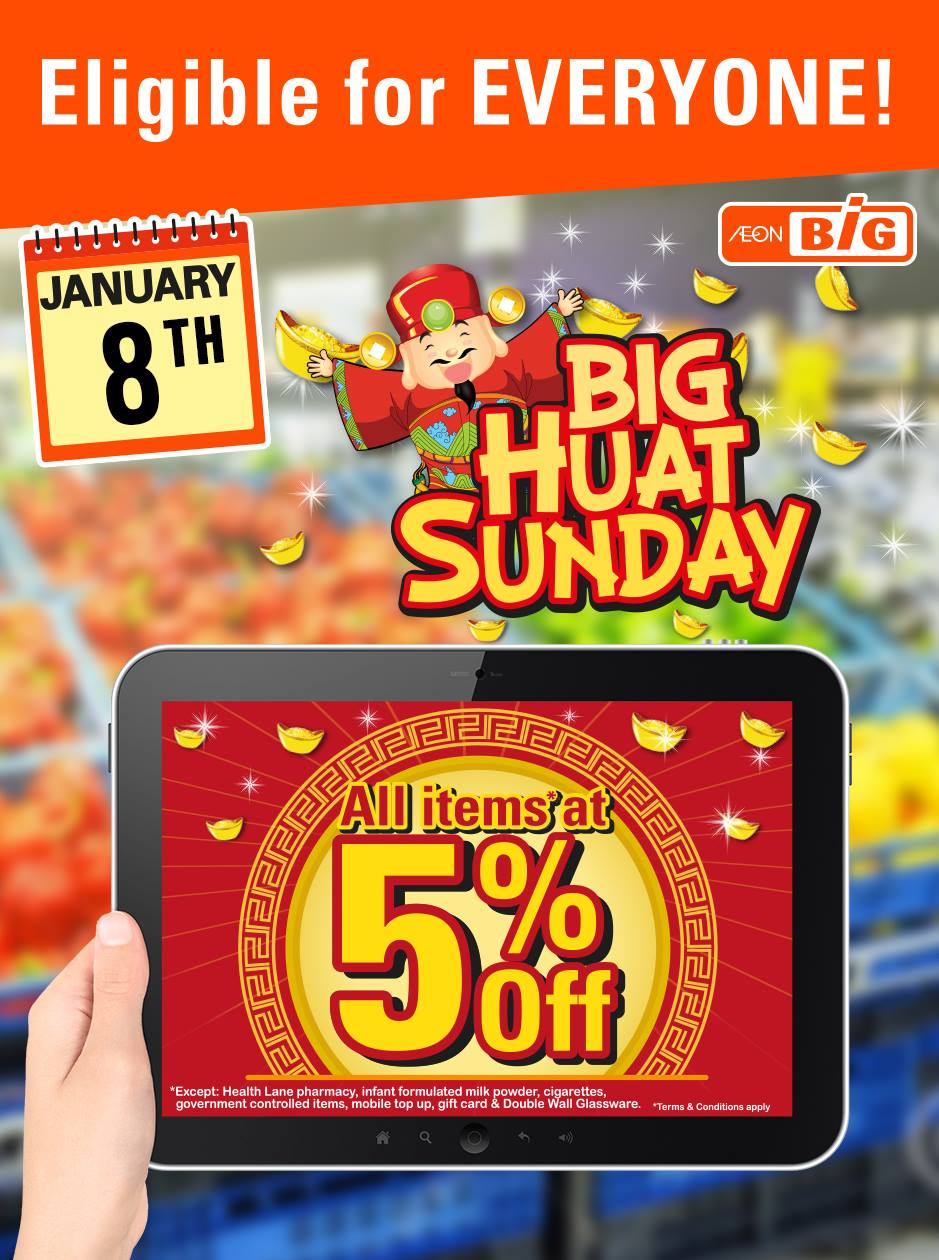 You almost forgot didn't you? Don't worry we're here to remind you… Grab all your favourite items with a 5% discount this Sunday, only at AEON BiG!All items at 5% OFF except: Health Lane pharmacy, infant formulated milk powder, cigarettes, government controlled items, mobile top up, gift card & Double Wall Glassware.