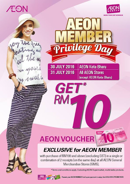 Just spend RM100 (excluding GST) in a single or combination of 2 receipts at AEON GMS (exclude Supermarket & Multimedia products) to GET* RM10 AEON Voucher at all AEON Stores on 31 July ‘16 (except AEON Kota Bharu on 30 July ’16).
