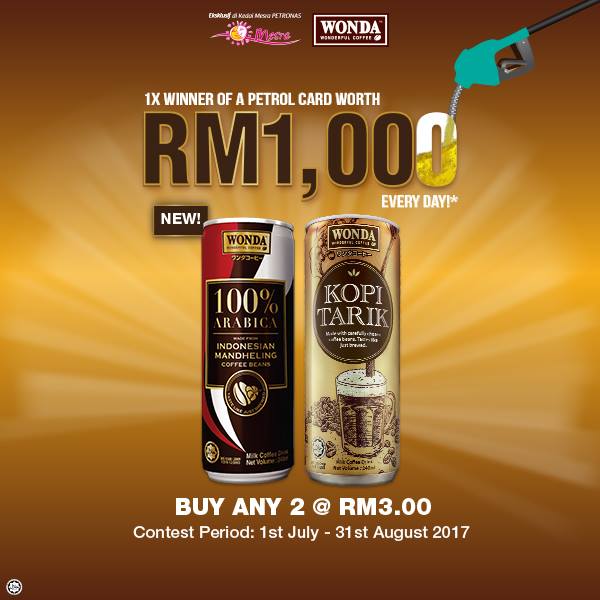 - BUY 2 WONDA Coffee at a promo price of RM3 in one (1) receipt from Kedai Mesra PETRONAS between 1 July - 31 August 2017.