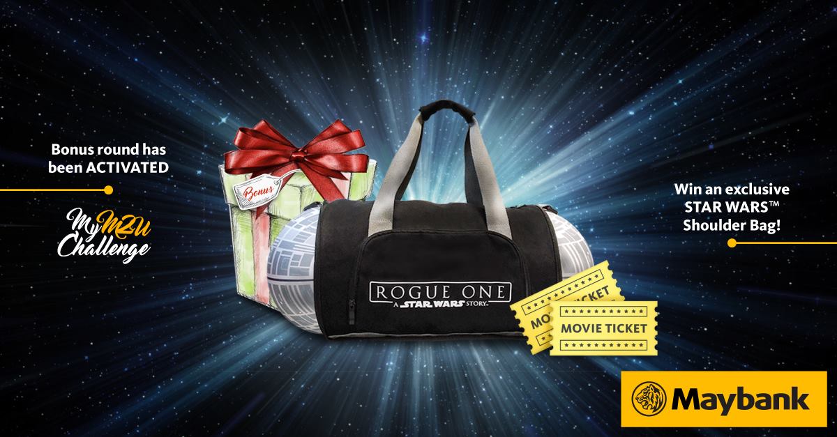 Surprise! #MyM2UChallenge Bonus Round has been activated. Be the first 2,000 to purchase movie tickets online at GSC & pay with Maybank2u. Login to M2U after your purchase and checkout the MyM2U Challenge ‘BONUS WIN’ tab!Hurry because we’re giving away limited edition Rogue One: A Star Wars Story Shoulder Bag. May the Force be with you!