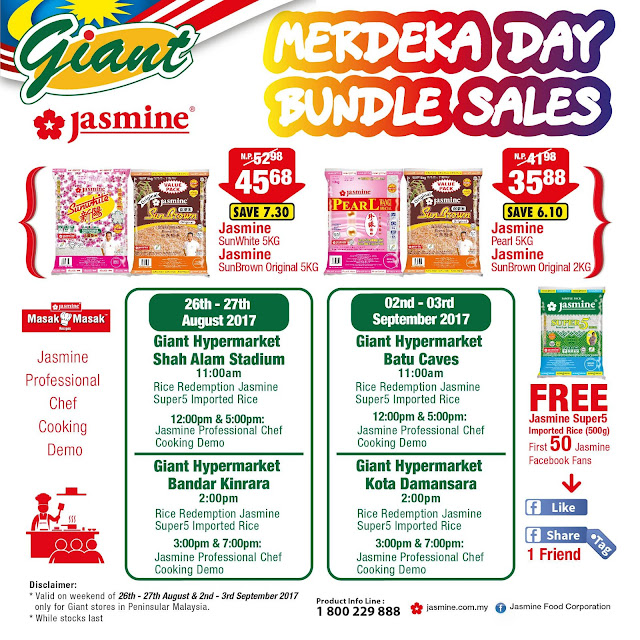 Get FREE 500g Jasmine Super5 Imported Rice! Just share this Giant's FB post and remember to tag a friend. To redeem, show your shared post to Jasmine's on-ground promoters at selected Giant stores on- 26 - 27 August 2017: Giant Hypermarket Shah Alam Stadium & Giant Hypermarket Bandar Kinrara