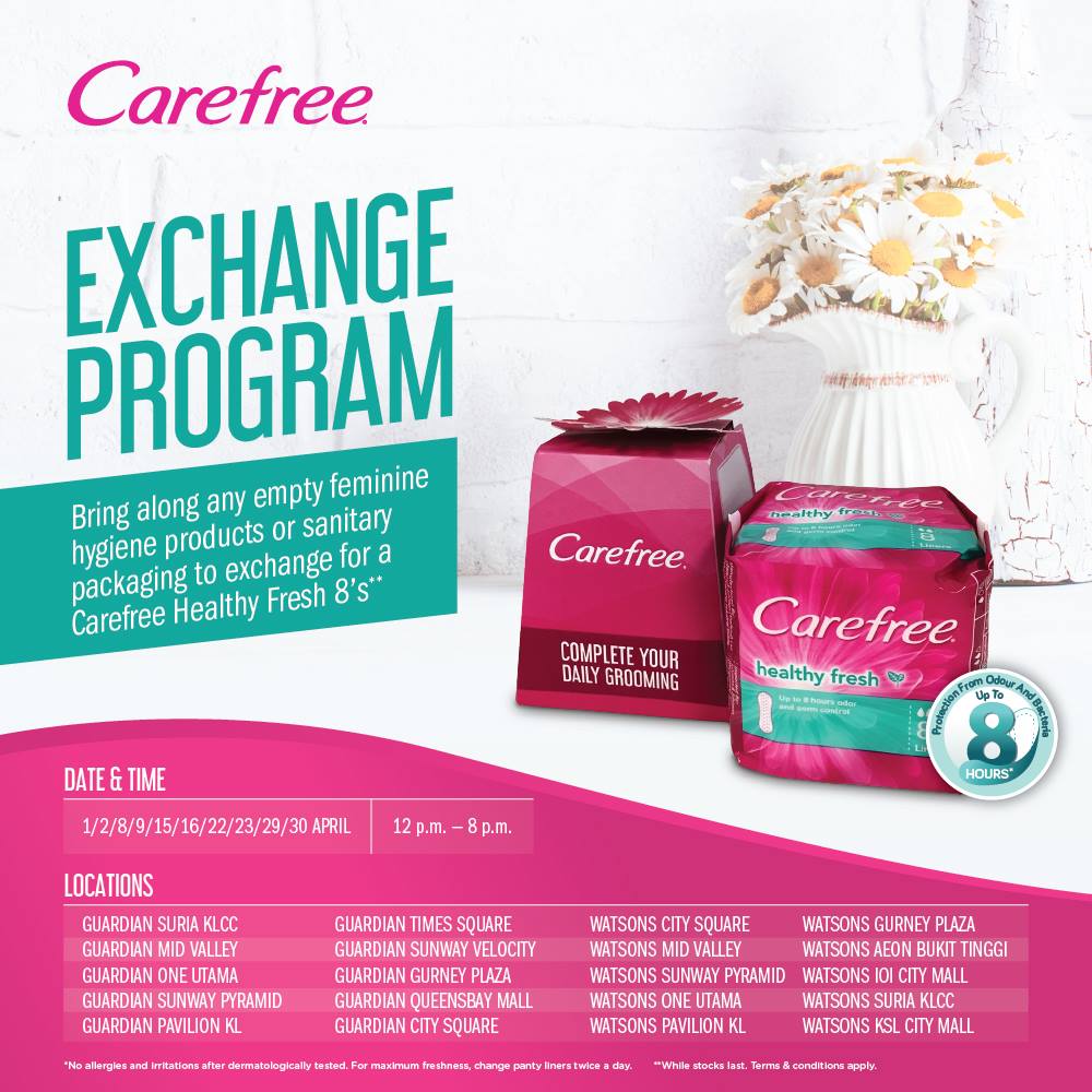 Good news ladies, receive a Carefree® Healthy Fresh 8 liners pack for FREE when you exchange any of your empty hygiene products or sanitary packaging at selected outlets.Don't miss out as this program is for a limited time only! Look for our product advisor in store for more details.