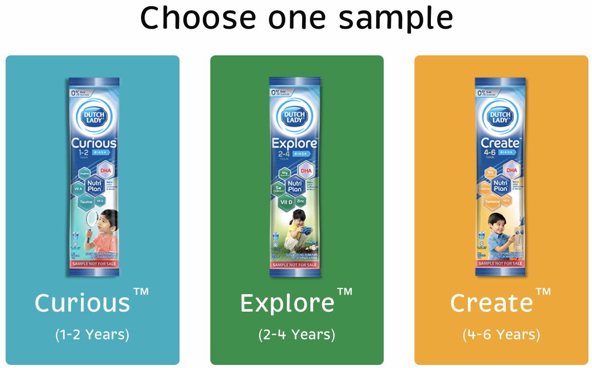 Start off your journey by receiving a free sample of Dutch Lady Nutri Plan™ with 5xDHA. Dapatkan sampel percuma di sini! Choose One Dutch Lady Nutri Plan Free Sample- Curious™ (1 - 2 Years)