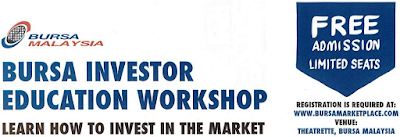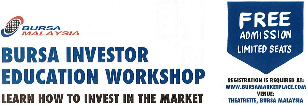 Date: 09 Oct 2016 Time: 9:00am to 5:00pm Venue: Penang Seats: 130 RSVP: Click here to reserve a seat Terms & Conditions of Free Investment Talks by Bursa Malaysia- An investor education programme designed to educate and equip retail investors with investing and trading knowledge through a series of financial and investment topics.