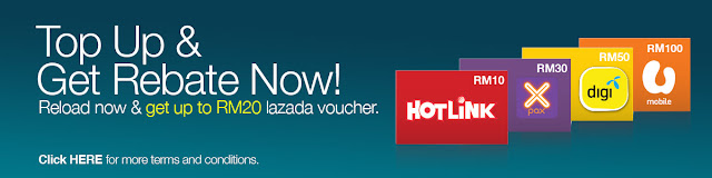 Free Lazada Voucher When Top Up Hotlink, Xpax, Digi, U Mobile or Tune Talk Mobile Reload 27 July - 31 August 2016