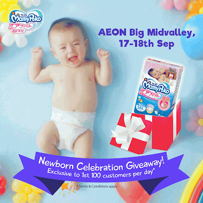 It's time to mark your shopping calendar to visit AEON Big, Mid Valley on 17th – 18th September 2016!MamyPoko is here with “Newborn Celebration Giveaway” to bring softest to skin - MamyPoko Air Fit from Japan for your Newborn! Be the FIRST 100 customers to purchase any pack of MamyPoko Air Fit (Newborn & S size) & receive one pack of MamyPoko AirFit S84 for FREE. Remember to bring your IC for verification purpose.