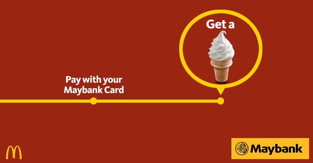 Great news! You can use your #MaybankCards at more McDonald’s restaurants now & Get a complimentary sundae cone with a minimum spend of RM10! While stock lasts.Participating Restaurants