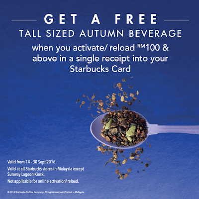 Free Tall Size Autumn Beverage When Reload RM100 into Starbucks Card 14 - 30 September 2016
