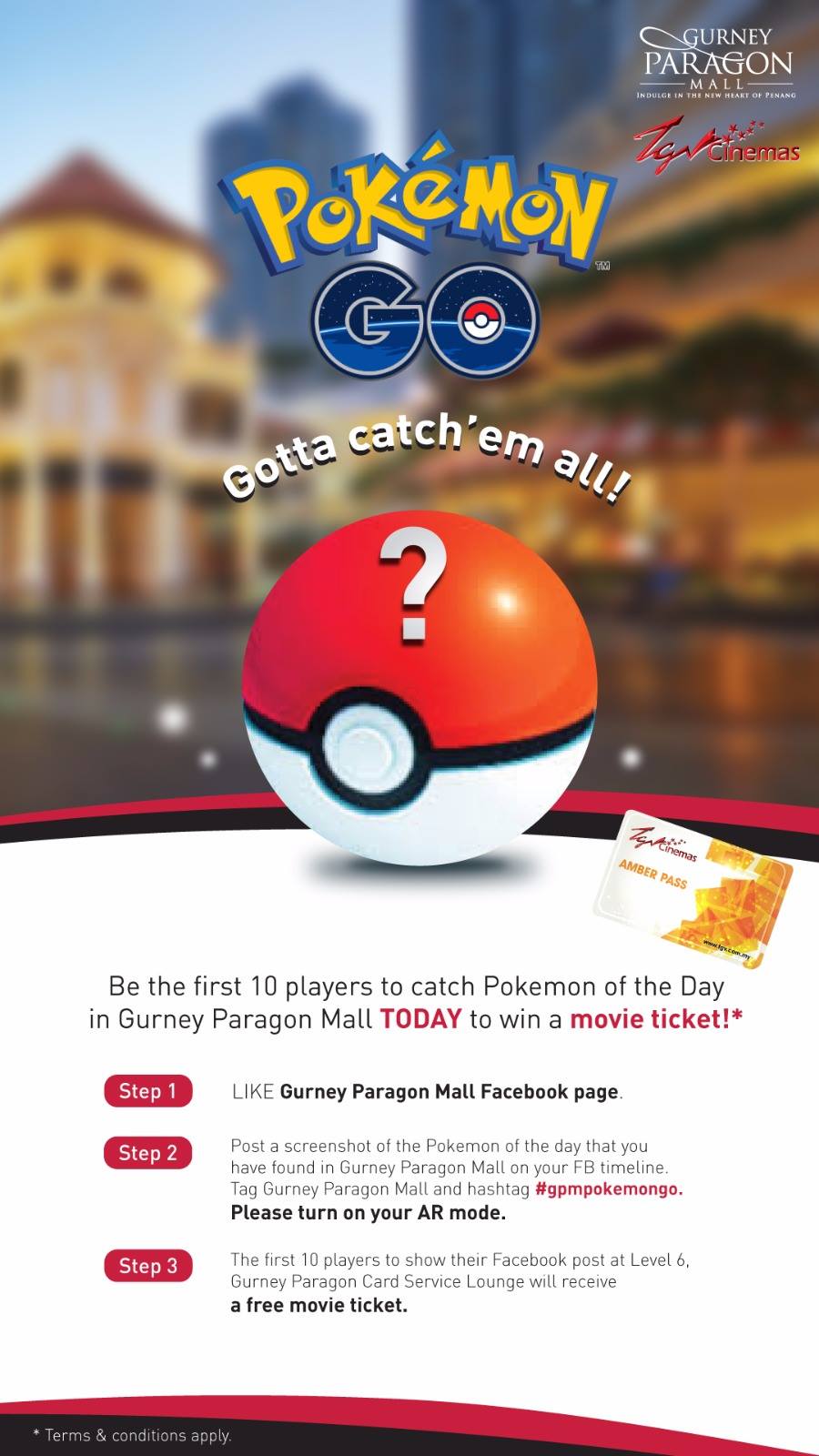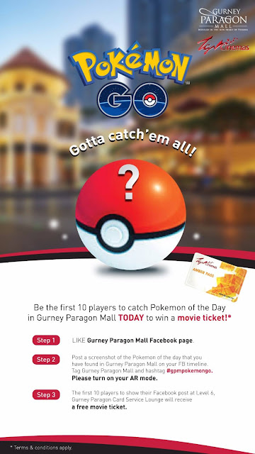Step 1: Like Gurney Paragon Mall Facebook Page Step 2: Post a screenshot of the Pokemon of the Day that you have found in Gurney Paragon Mall (turn on AR mode) on your FB timeline. Remember to tag Gurney Paragon Mall and hashtag #gpmpokemongo
