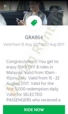 You get to enjoy RM8 OFF 8 rides in Malaysia. Valid from 15 - 22 August 2016. Valid for the first 5,000 redemption daily. Valid for targeted users who received a notification from Grab. You get to enjoy RM6 OFF 10 rides in Malaysia. Valid from 15 - 22 August 2016. Valid for the first 5,000 redemption daily. Valid for SELECTED PASSENGERS who received a notification from Grab.