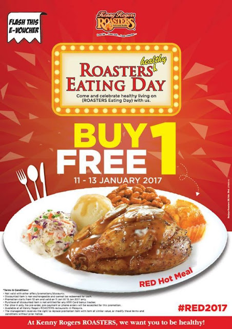 Kenny Roger ROASTERS Healthy Eating Day: Come and celebrate healthy living on (ROASTERS Eating Day) with us. Flash this e-voucher to enjoy buy one free one from 11 to 13 January 2017 at all KRR restaurants in Malaysia.KRR RED Hot Meal Buy 1 Free 1 E-Voucher Promo Term & Conditions