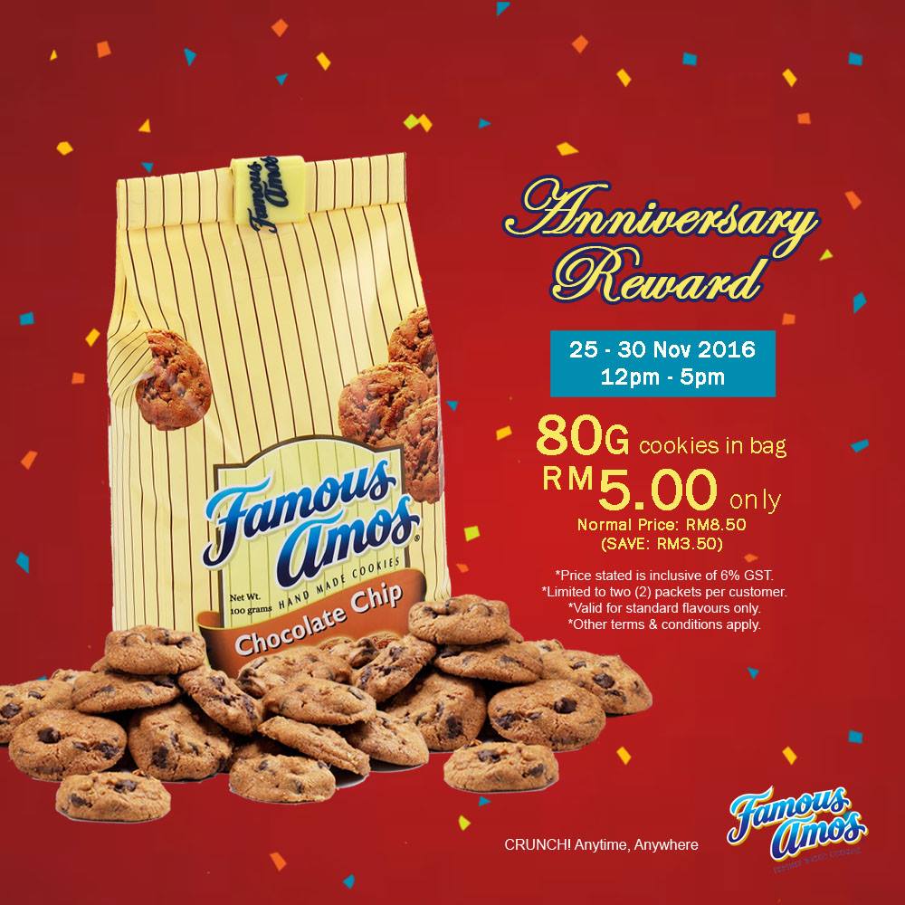 - Famous Amos 80g cookies in bag promo price: RM5.00