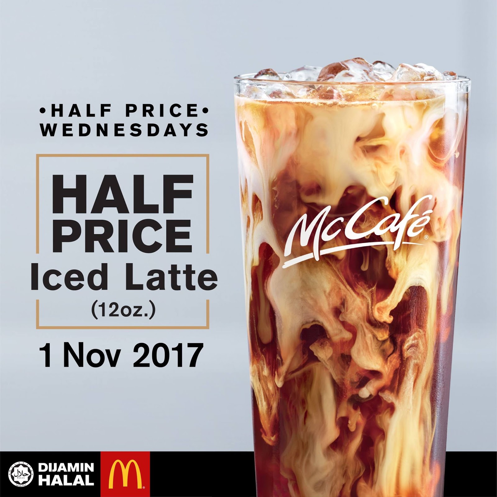 [McCafe® Half Price Wednesday 1 Nov 17] It’s HALF PRICE WEDNESDAY! Enjoy a McCafe® Iced Latte (12oz.) at half the price on 1 Nov 17.Just show this Facebook post to our barista at your favourite McDonald’s® Malaysia restaurant to enjoy the offer. It’s that simple!