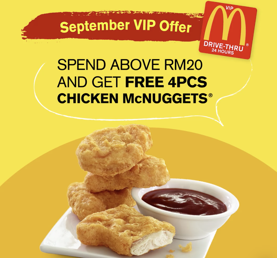 Enjoy more great food with McD Drive-Thru™ VIP rewards! Just purchase above RM20 in September and get FREE 4pcs Chicken McNuggets®! Don't forget to ask for your FREE VIP car sticker to enjoy all the yummy monthly rewards!