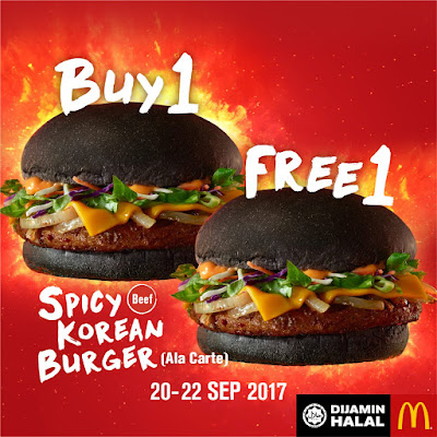 Buy One Get One Free Spicy Korean Burger (Beef) Mid-Month Special: 20-22 Sept 2017Just show this Facebook post to our crew at your favourite McDonald's Malaysia restaurant to enjoy the offer. It's that simple!