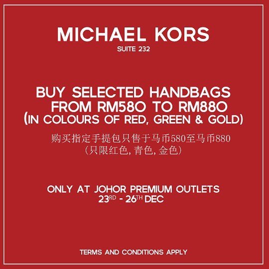 Buy selected handbags from RM580 to RM880 (in colours of red, green & gold) only at Johor Premium OutletsMichael Kors Special Sale 23 to 26 December Selected handbags from RM580 to RM880