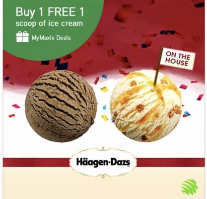 You need to login to your MyMaxis app to grab this deal and redeem at any Haagen-Dazs Malaysia outlets nationwide. Promotion period from 1st to 31st May 2017.MyMaxis Haagen Dazs Buy 1 Free 1 Deal Terms & Conditions