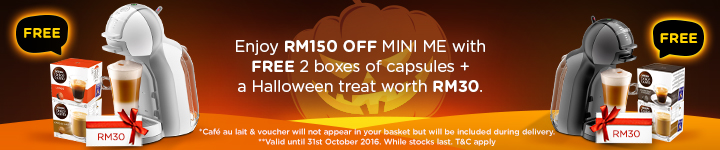 Get RM150 OFF MINI ME machine with 2 FREE boxes of capsules + a Halloween treat worth RM30. Save RM239.80 today.MINI ME AUTOMATIC GREY WHITE Normal Price: RM529.00 Discount Price: RM379.00 (Save RM150)