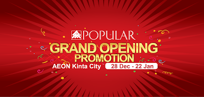 28 Dec, this is the day! Experience the excitement of the Grand Opening of POPULAR @ AEON Kinta City from 28 Dec- 22 Jan. Save 20% off your entire purchase on ALL Books (except text & assessments), don’t ever forget snap up the vouchers and freebies with your purchase! Do it now, there’s no try!从12月28日至1月22日,POPULAR@AEON Kinta City重新开张咯。好多优惠准备好等您来!