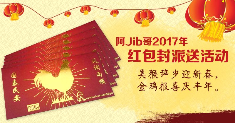 美猴辞岁迎新春,金鸡报喜庆丰年─阿Jib哥2017年红包封派送活动 华人农历新年即将到来,阿Jib哥面子书特别推出限量版红包封送给网民。此次更以特别设计的贺卡搭配送出,向网民贺年。您只要“LIKE/ 赞”阿Jib哥面子书,并点击以下链接进入应用程式填写姓名、联络地址、电话及电邮,管理员便会为您寄出这喜洋洋的红包封,先到先得,送完为止。恭祝大家新年进步,万事如意!
