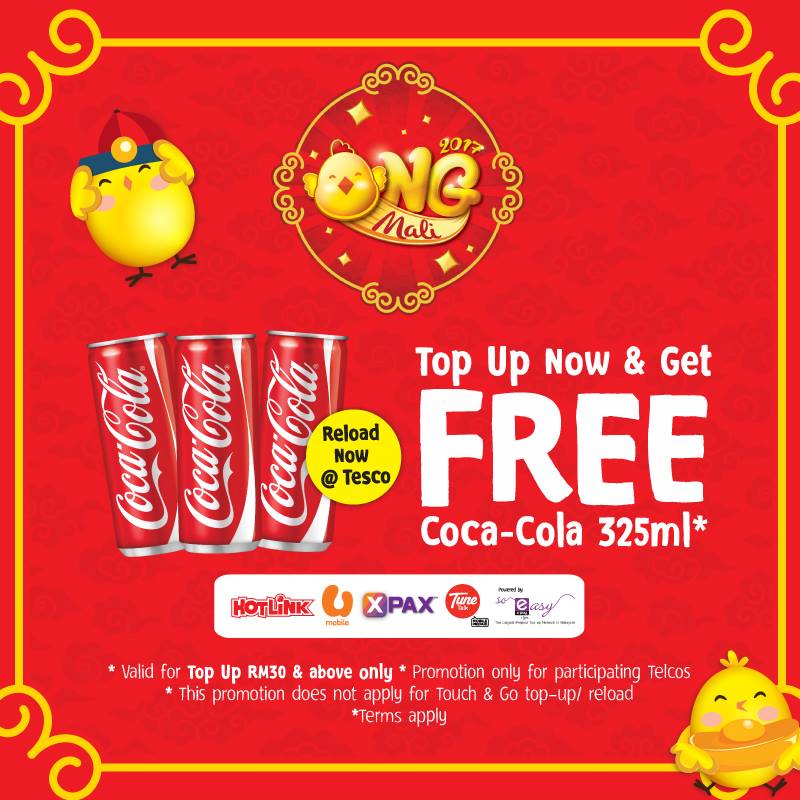 Get a FREE Coca-Cola 325ml* when you reload your mobile credit at any Tesco stores. Only valid for top-up RM30 and above only. Valid until 15th March 2017. This promotion does not apply for Touch & Go top-up/reload. Don’t miss out!