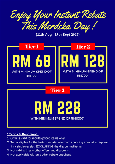 Promotion Period: 11th Aug - 17th Sept 2017- Tier 1: Enjoy Instant Rebate of RM68 (minimum purchase of RM400 in a single receipt)