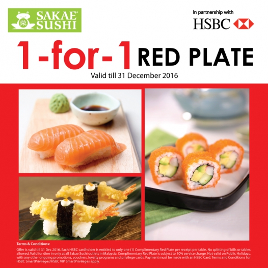 Calling all HSBC cardholders - here comes an awesome privilege for you! Enjoy 1-For-1 Red Plate deals from now till 31 Dec 2016 at any Sakae Sushi in Malaysia. T&C apply.Sakae Sushi 1-for-1 Red Plate Promo Terms & Conditions