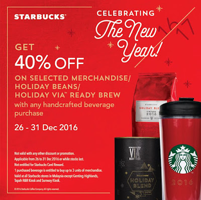 Starbucks 40% Off Merchandises/Holiday Beans/VIA with Any Handcrafted Beverage Purchase 26 - 31 December 2016