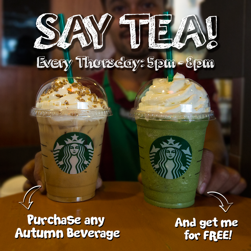 We've got the perfect cure for your mid-week madness. Come on over to our stores tommorow from 5pm-8pm to enjoy two frapps for the price of one. Buy an Autumn beverage to enjoy any handcrafted beverage for free! So set a reminder and we'll see you there! :DStarbucks Buy One Free One Promo Terms & Conditions