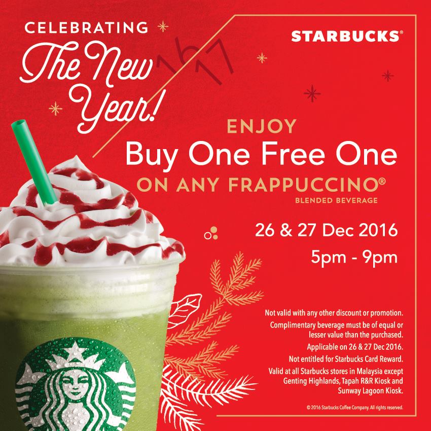 The holiday celebration continues as we now countdown to the New Year! Tomorrow and 27th, enjoy Buy One Free One on your favorite Frappuccino. Merry Christmas and Happy New Year!Starbucks Malaysia Buy 1 Free 1 Promo Terms & Conditions