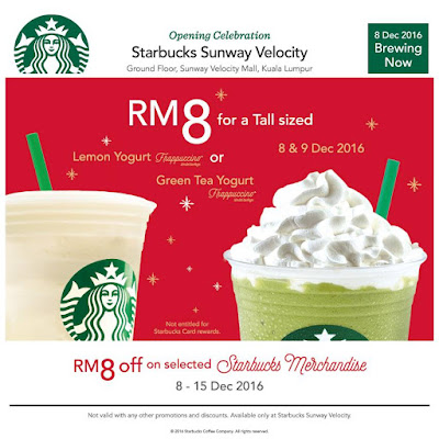 Another awesome celebration coming up! Tomorrow, celebrate the opening of our Starbucks Sunway Velocity store with promotions. See you there!- 8 & 9 Dec 2016: RM8 for a tall sized Lemon Yogurt Frappuccino blended beverage or Green Tea Yogurt Frappuccino blended beverage. *Not entitled for Starbucks Card rewards.
