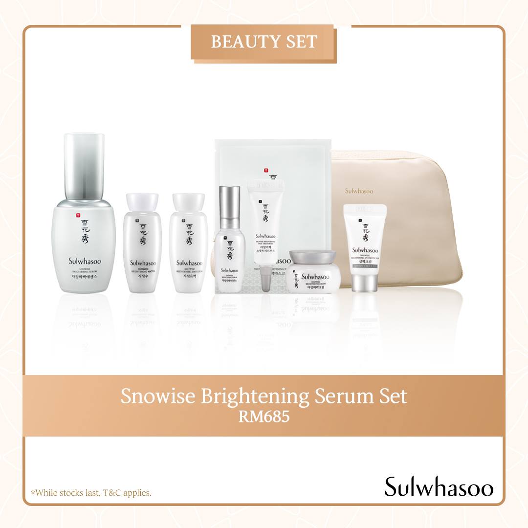 Snowise Brightening Serum Set (RM685) consists of Snowise Brightening Serum 50ml, a 7-piece travel kit & a pouch.* While stocks last. T&C applies.