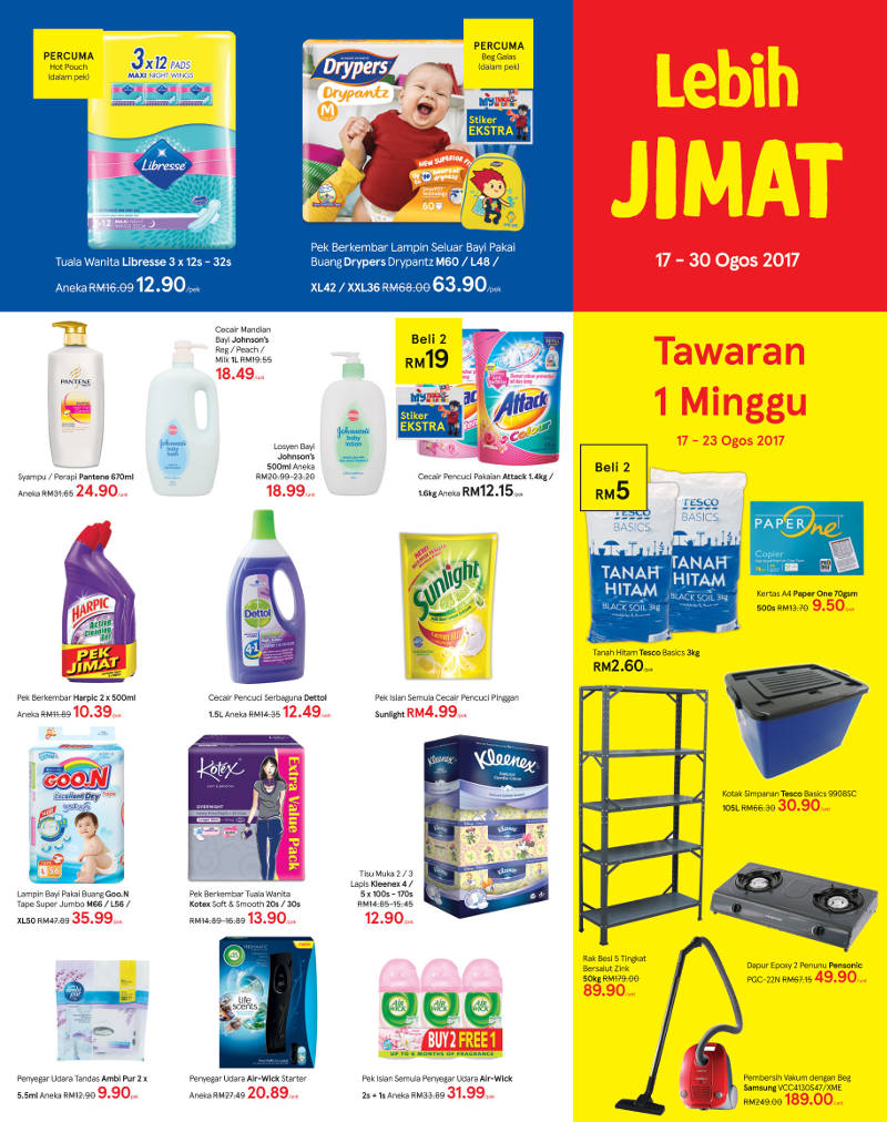 Tesco Lebih Jimat More Saving Weekly Deals 2017: Dapatkan pelbagai penjimatan untuk keperluan anda dengan Tesco! August‘s Issue Promotion starts from 17 - 30 Aug (View / download our catalogue via link) Layari link untuk melihat katalog baru kami atau dapatkannya di stor Tesco berdekatan anda. Link