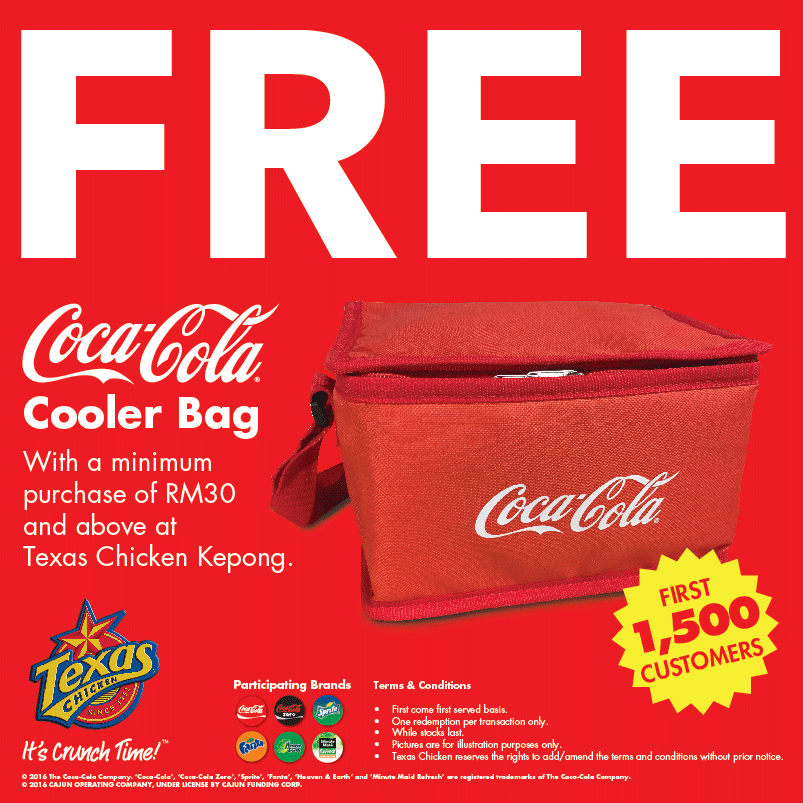 FREE Coca-Cola Cooler Bag with a minimum purchase of RM30 and above at Texas Chicken Kepong.For our opening launch at Kepong on Dec 16, we're giving away 1,500 units of Coca-Cola Cooler Bags with a minimum purchase of RM30.