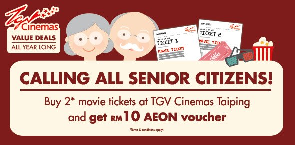 A special deal just for the Senior Citizens in TGV Cinemas Taiping!Purchase min 2 Senior Citizens’ movie tickets and get 1 (ONE) RM10 Aeon Voucher. Added Bonus : Senior Citizen value deal is extended to FULL DAY on both weekdays and weekends from 23 Feb – 23 March 2017.