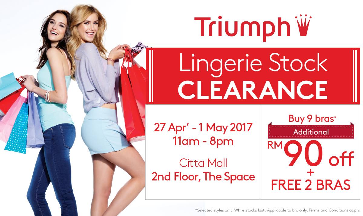 TRIUMPH LINGERIE STOCK CLEARANCE Enjoy offers of up to 70% and more... Every 9 bras gets an extra RM90 off PLUS you'll get another 2 bras for FREE!5 Days of Amazing Offers! 30,000 stocks on clearance including bras, undergarments, lingeries, sleepwear and more! The more you get the better the deal.