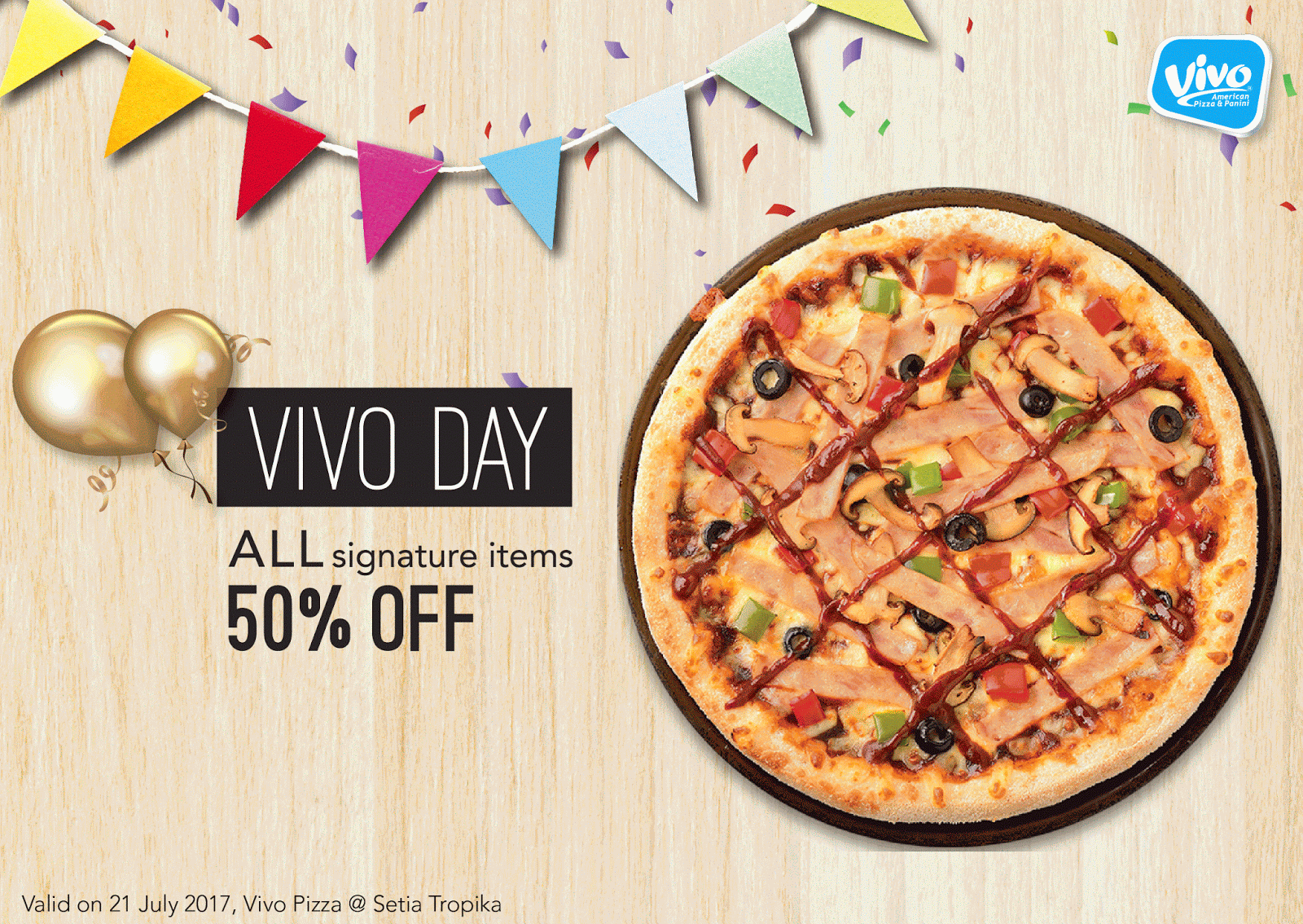 It's Vivo Day again! Enjoy 50% OFF ALL signature items!ONLY at Vivo Pizza Setia Tropika on Friday (21 July 2017)!