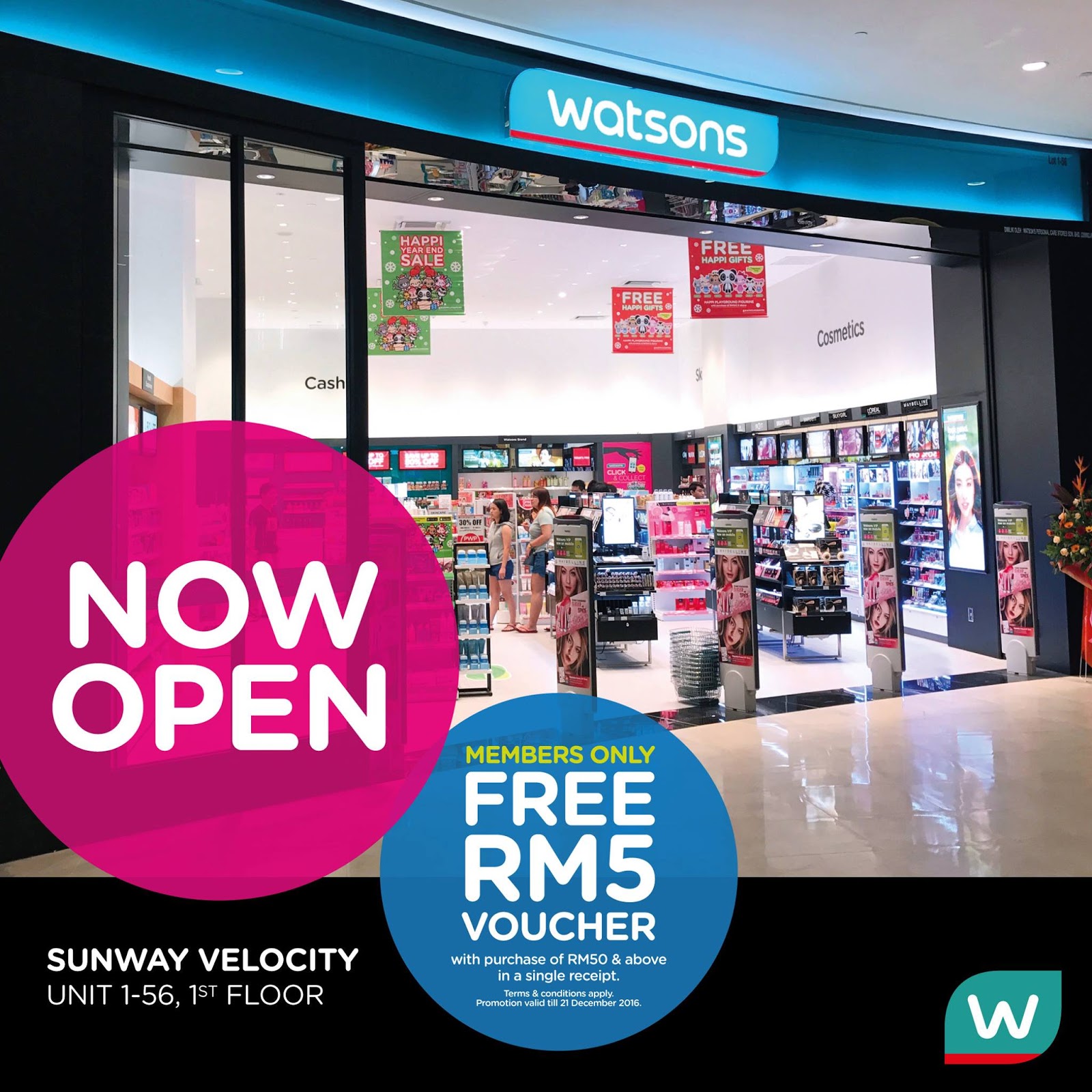 Watsons Members Free RM5 Voucher (Minimum Purchase: RM50) @ Sunway Velocity Mall Store Until 21 December 2016