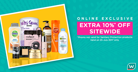 TODAY'S ONLINE SPECIAL! Stock up your favourite health & beauty products and get EXTRA 10% OFF* sitewide.*Terms & Conditions apply. Promo valid on all products sitewide except for Sanitary Protection products. Promo applicable on 25 July 2017 only at Watsons Online. Not applicable for ongoing promotions.