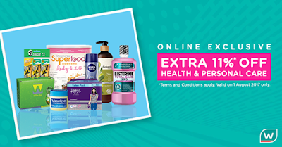 TODAY'S ONLINE SPECIAL! Enjoy EXTRA 11% OFF on all your favorite Health and Personal Care products. Shop ONLINE now!*Terms & Conditions apply. Promo valid on all Health and Personal Care products only on 1 August 2017 at Watsons Online. Not applicable for ongoing promotions.