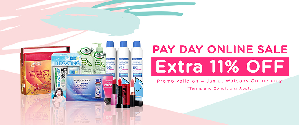Today's ONLINE Special! Enjoy Pay Day Sale shopping with EXTRA 11% OFF at Watsons ONLINE*Terms & condtitions apply. Promotion valid on 4 January 2017 at Watsons Online Store only.